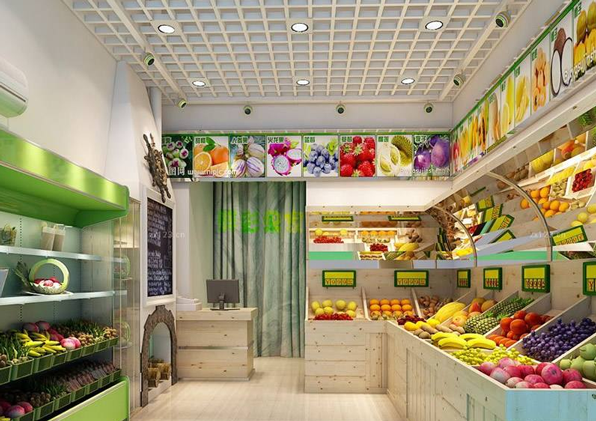 天花板的吊頂:不用太過復(fù)雜,但是要注意裝飾,可以在天花板上懸掛一些塑料的綠色的枝葉和水果,以突出水果店的自然、綠色和健康。