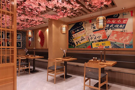 壽司店的地面很容易沾染油污或者被潑灑酒水,所以無(wú)論是用地磚還是地板,都必須是吸水性強(qiáng)、防滑效果明顯的那種。地面可以使用仿木紋地磚,不僅美觀,還防滑耐用。而吧臺(tái)臺(tái)面可采用拉絲不銹鋼材料,吧臺(tái)立面采用鋼化玻璃飾面,內(nèi)置燈光,既美觀又容易清理。