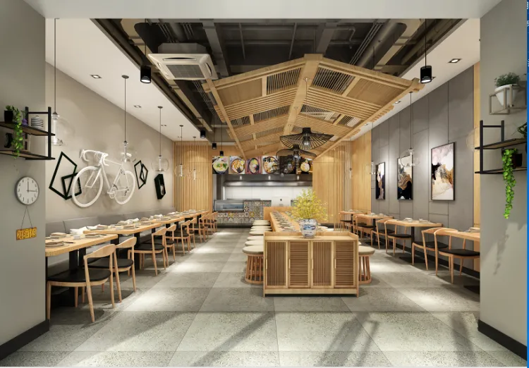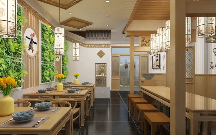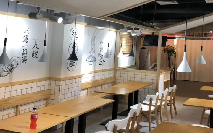 面館的整體空間較小,可采用左、中、右分布,左右兩邊按照橫向進(jìn)行擺放,這樣可以使得整個空間布局視覺上更加開闊,使得整個店鋪看上去有秩序,有氛圍,空間靈活性、整體性更大;如果布局分布不合理,會給人混亂沒有秩序,給消費(fèi)者也是一種不舒適的感覺,小面館裝修要以簡約實(shí)用為主,這樣給消費(fèi)者一種舒適感。